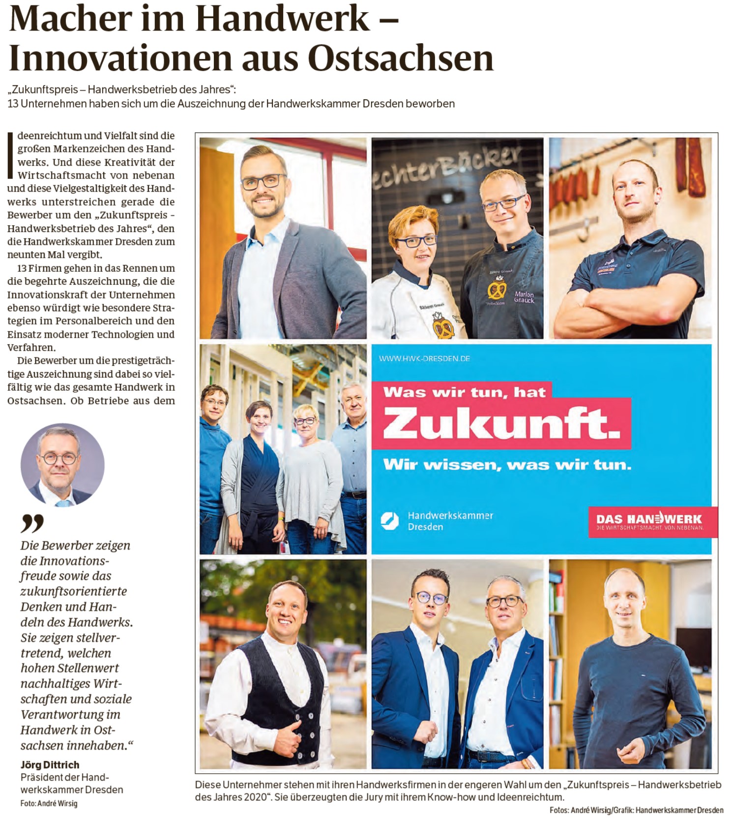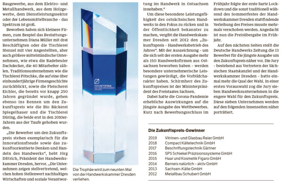 Obwohl auf Grund der aktuellen Situation noch keine Preisverleihung stattfinden konnte, freuen wir uns bereits über den Platz unter den ersten 7 Unternehmen, über die in einer Sonderausgabe der Deutschen Handwerks Zeitung berichtet wurde.